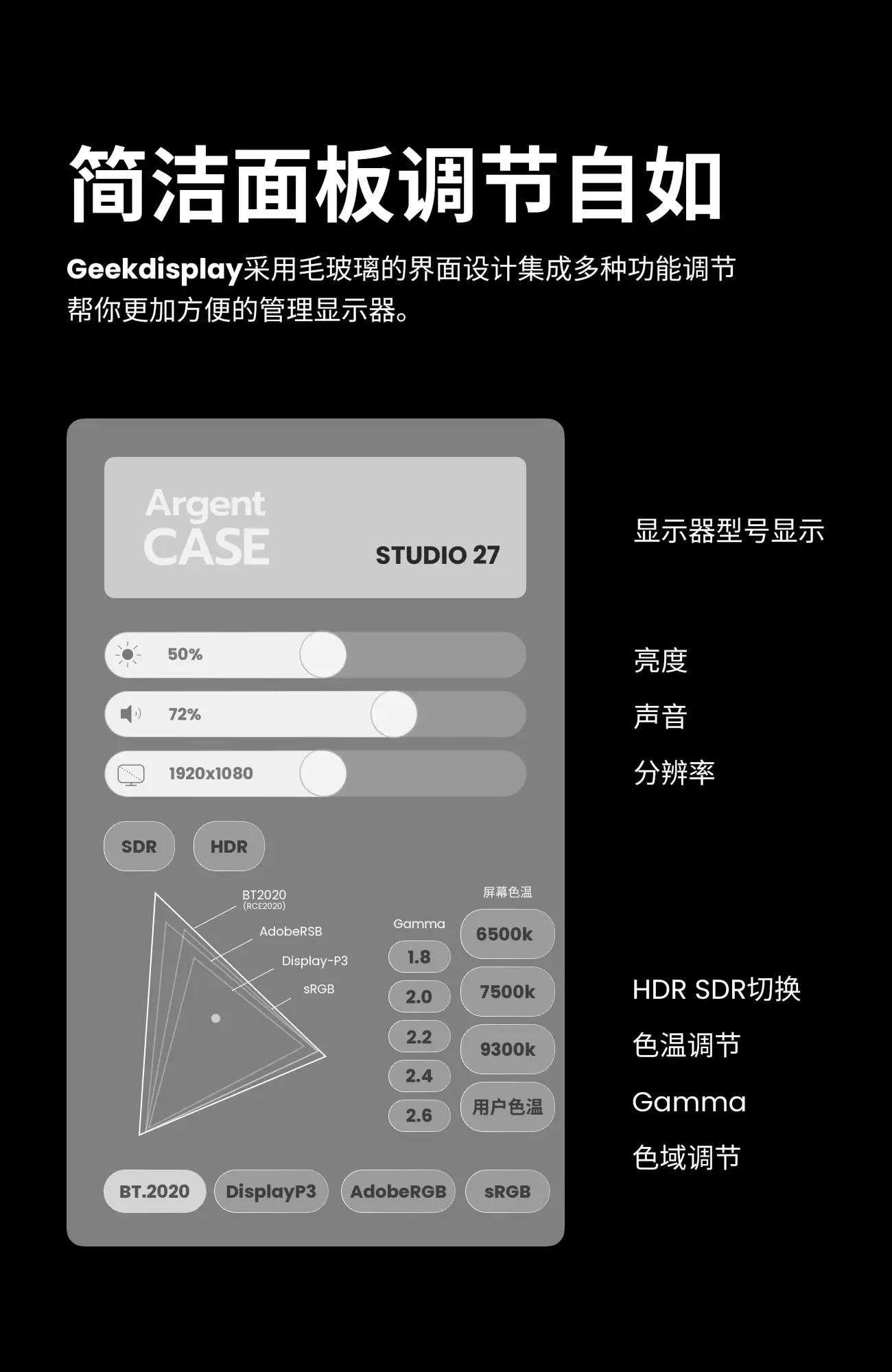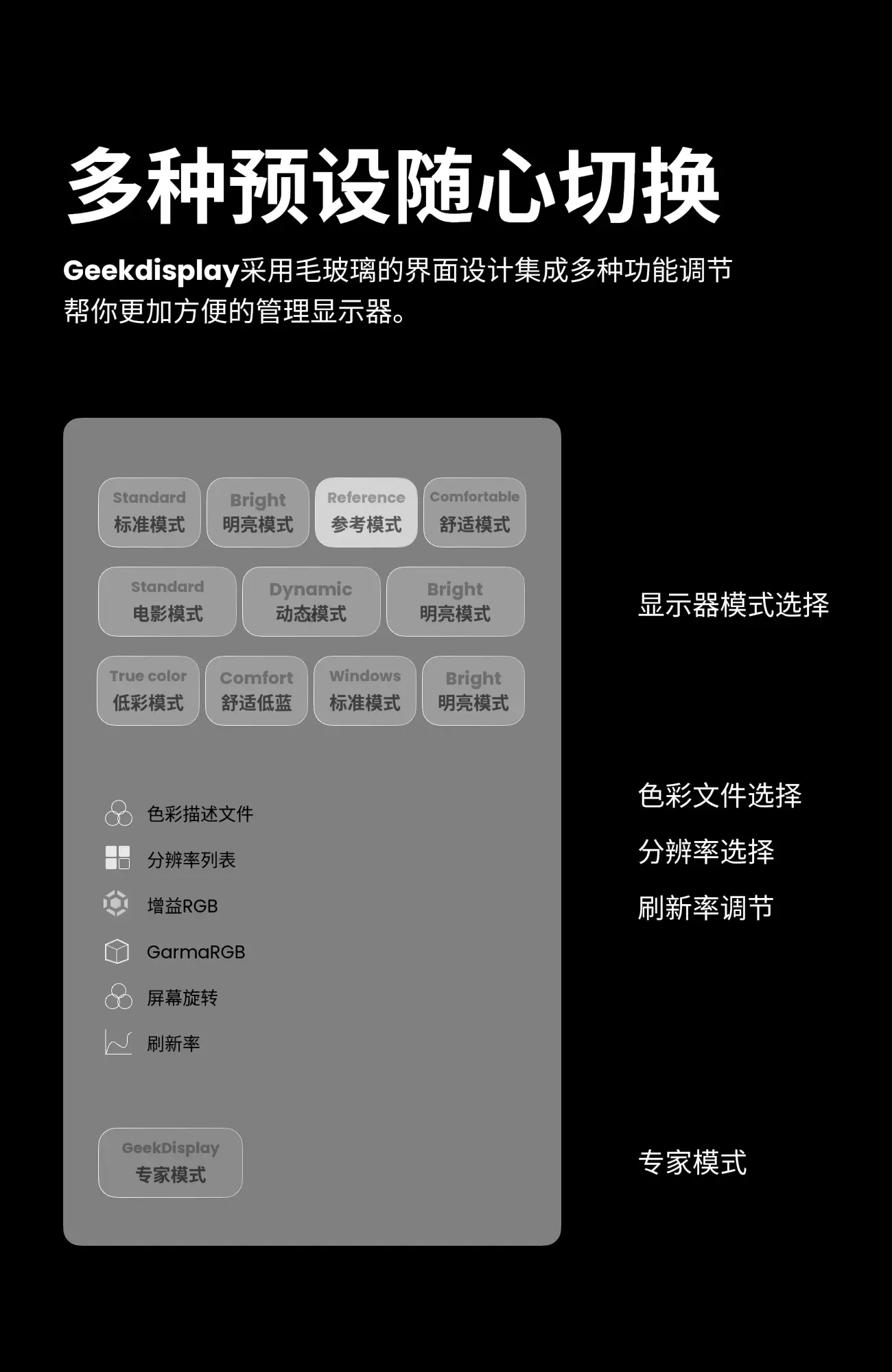 丝滑操控纵享自由Geekon推出全新显示器调节软件无需调节OSD菜单,只需打开GeekDisplay即可轻松设置屏幕。无论是设计师、程序员还是MacBook用户,您都可以拥有量身定制的功能来满足您的需求。